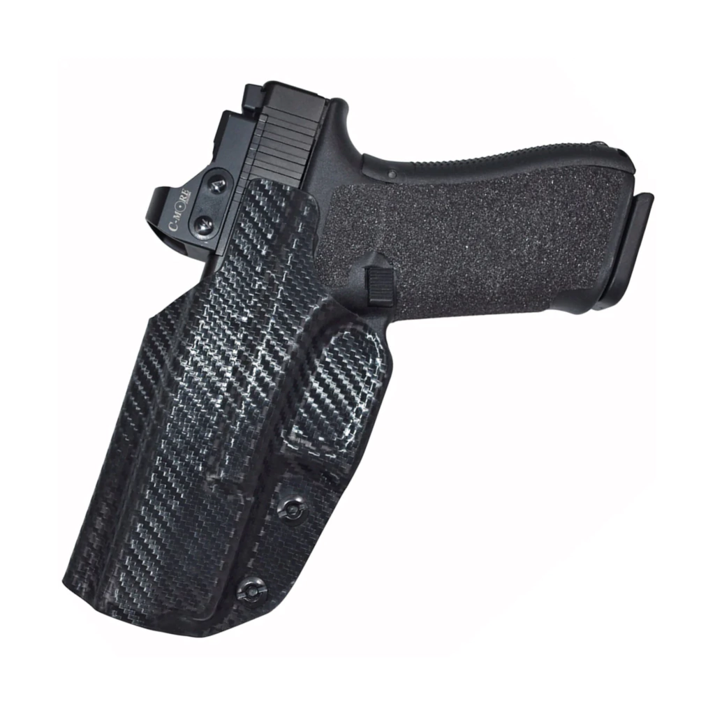 La funda plegable con ala de cinturón ofrece una forma discreta de llevar el arma en el apéndice. Es compatible con prácticamente cualquier mira de punto rojo del mercado y su diseño de boca abierta permite el paso de cañones roscados. La zona saliente del gatillo presiona contra la parte trasera del cinturón para reducir la presión.